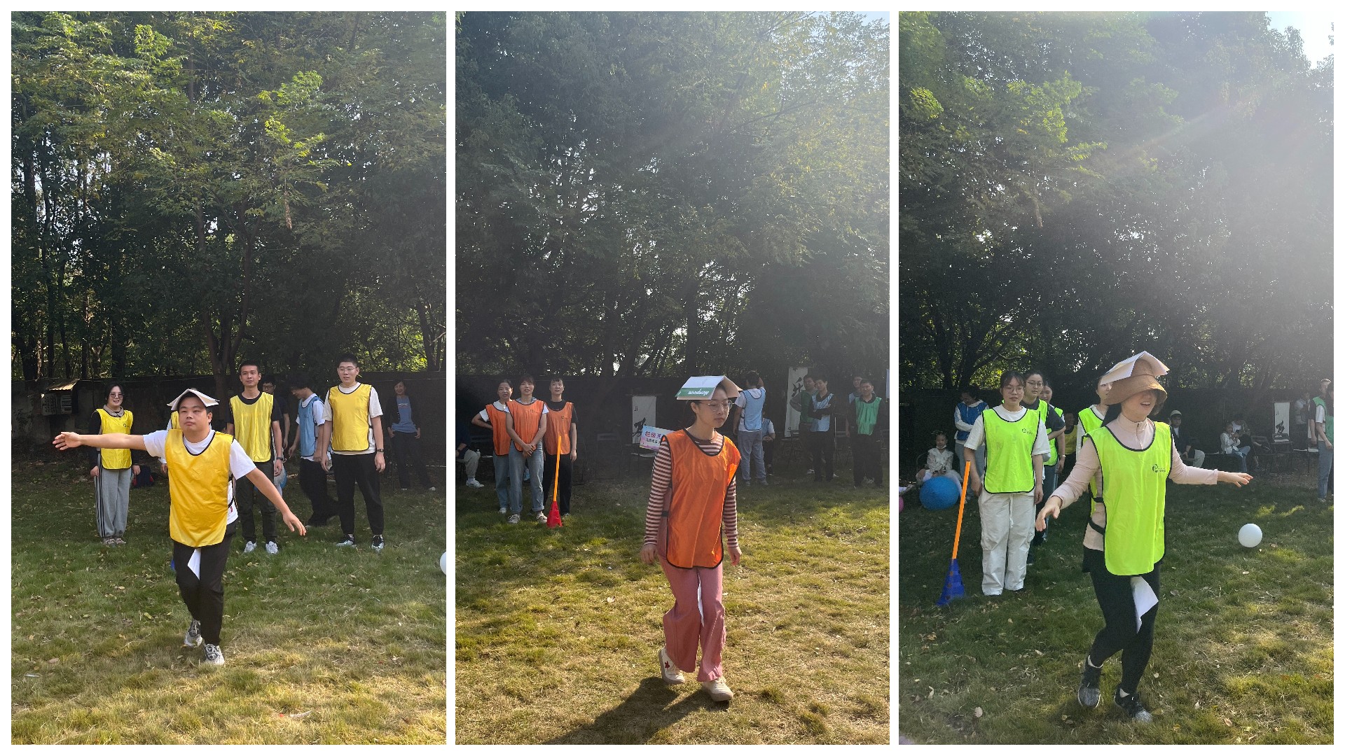 游戲要求:雙腿夾紙,頭頂本子,紙和本子不能落地。