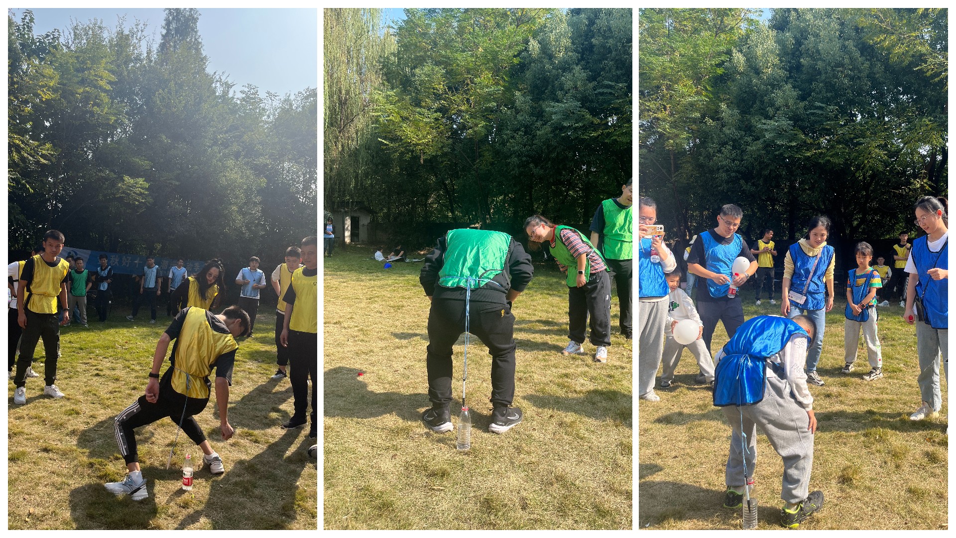 游戲要求:每隊需派出四名代表,原地轉三圈后,通過調整身體將系在腰間的筆放進水瓶。