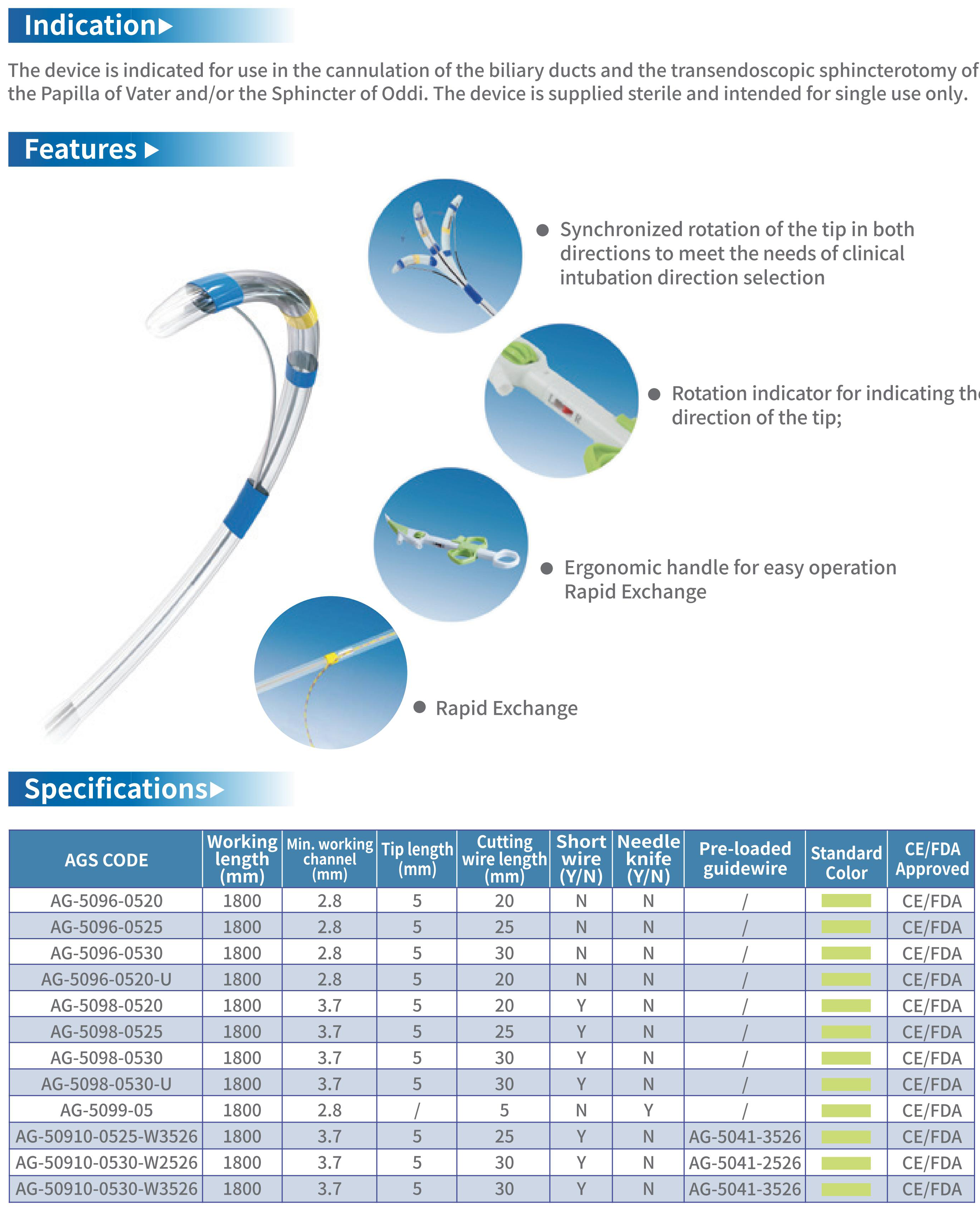 Indication:The device is indicated for use in the cannulation of the biliary ducts and the transendoscopic sphincterotomy of the Papilla ofVater and/or the Spincter of Oddi. The device is supplied sterile and intended for single use only.