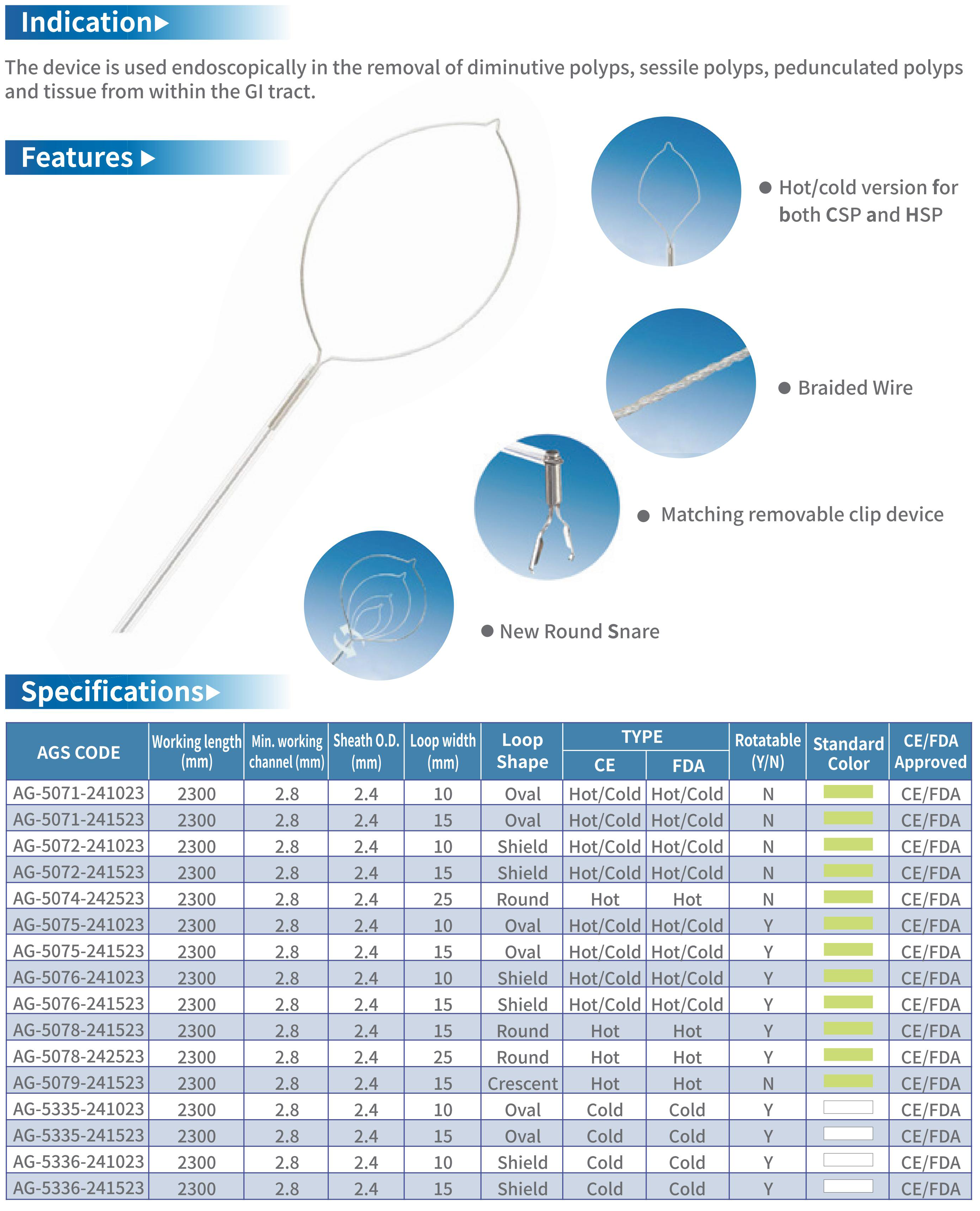 Indication:The device is used endoscopically in the removal of diminutive polyps, sessile polyps, pedunculated polyps and tissue from within the GI tract.